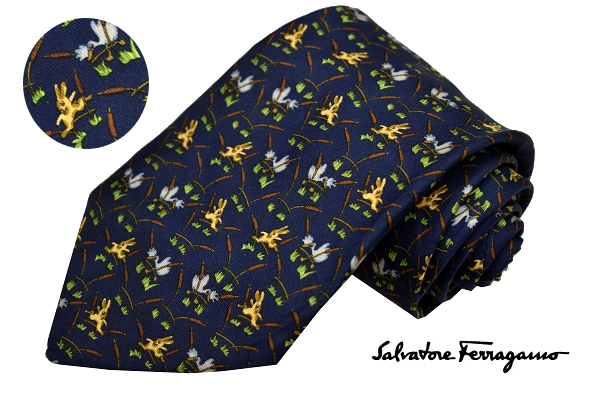 > N-2977★送料無料★Salvatore Ferragamo サルヴァトーレフェラガモ★イタリア製 ネイビー系 アヒル うさぎ ガチョウ シルクネクタイ