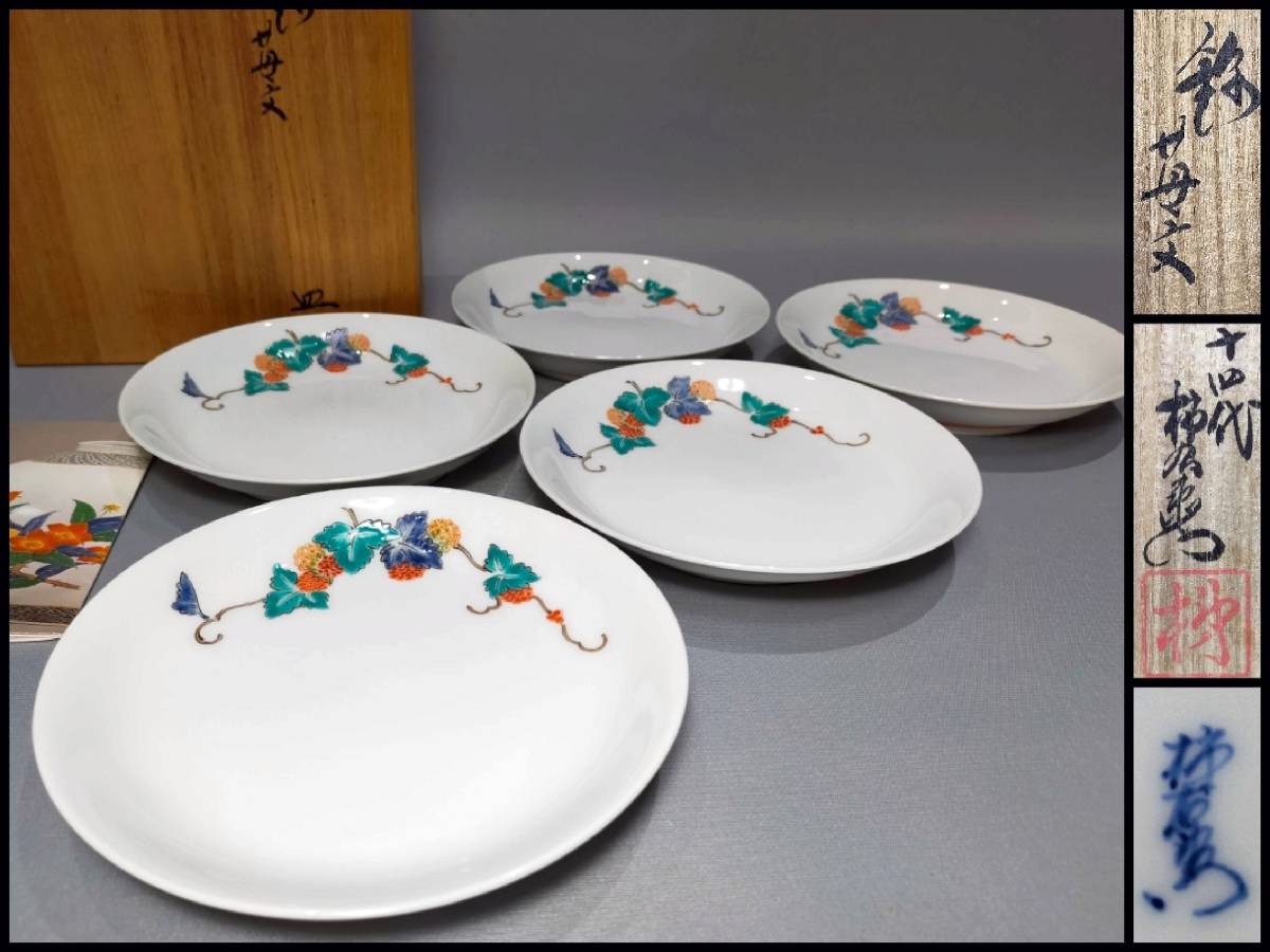 > KA28 十四代 酒井田柿右衛門 錦 苺文 皿 五客 5寸 幅15.2㎝ 栞・共箱付