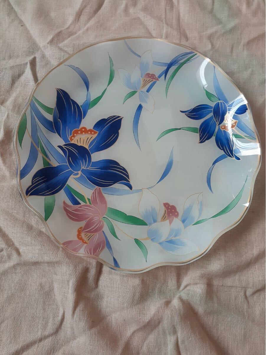 - 新品未使用 お皿 ガラス皿 フリル丸大皿 金蘭 花柄皿 直径約27cm キッチン用品