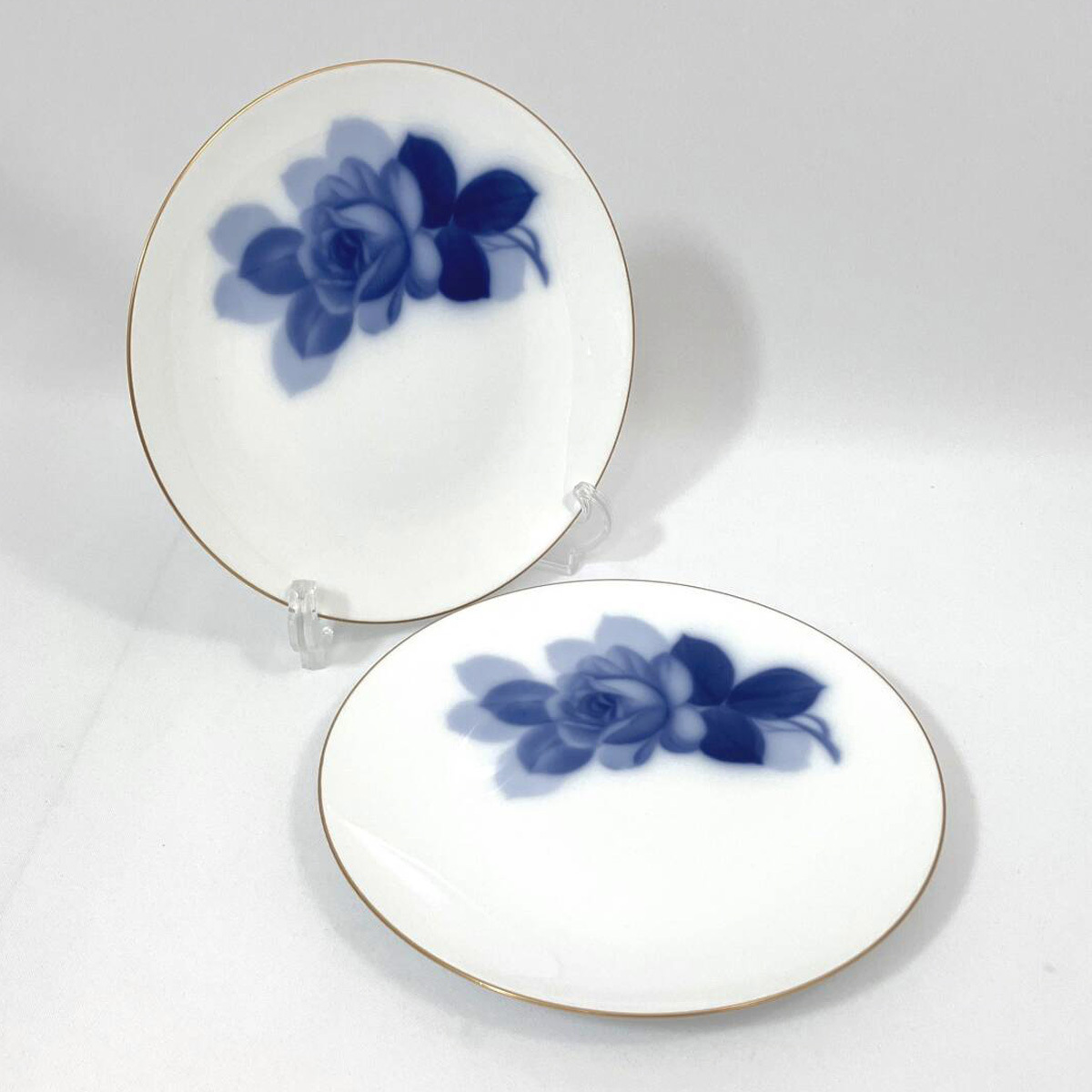 > 【良品】大倉陶園 ブルーローズ デザート皿 2枚セット 約19cm プレート 金彩 白磁 ケーキ クープ皿 OKURA