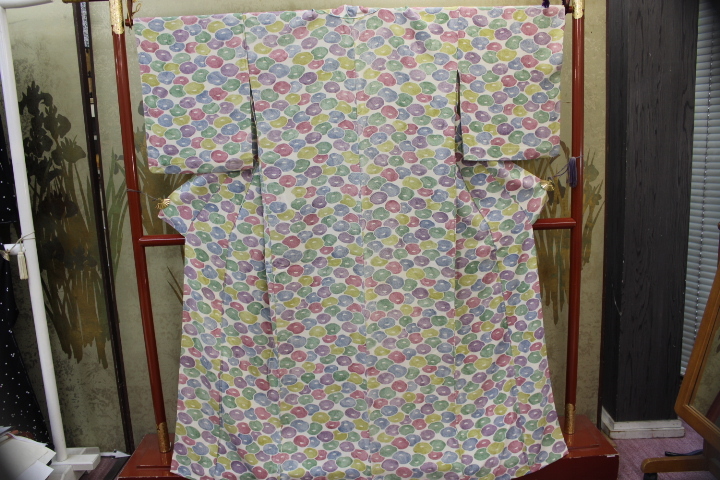 > きもの今昔8535 単衣のきもの 正絹一越地広衿セブセ付き単衣仕立て 鮫小紋五色万寿菊 身丈160cm