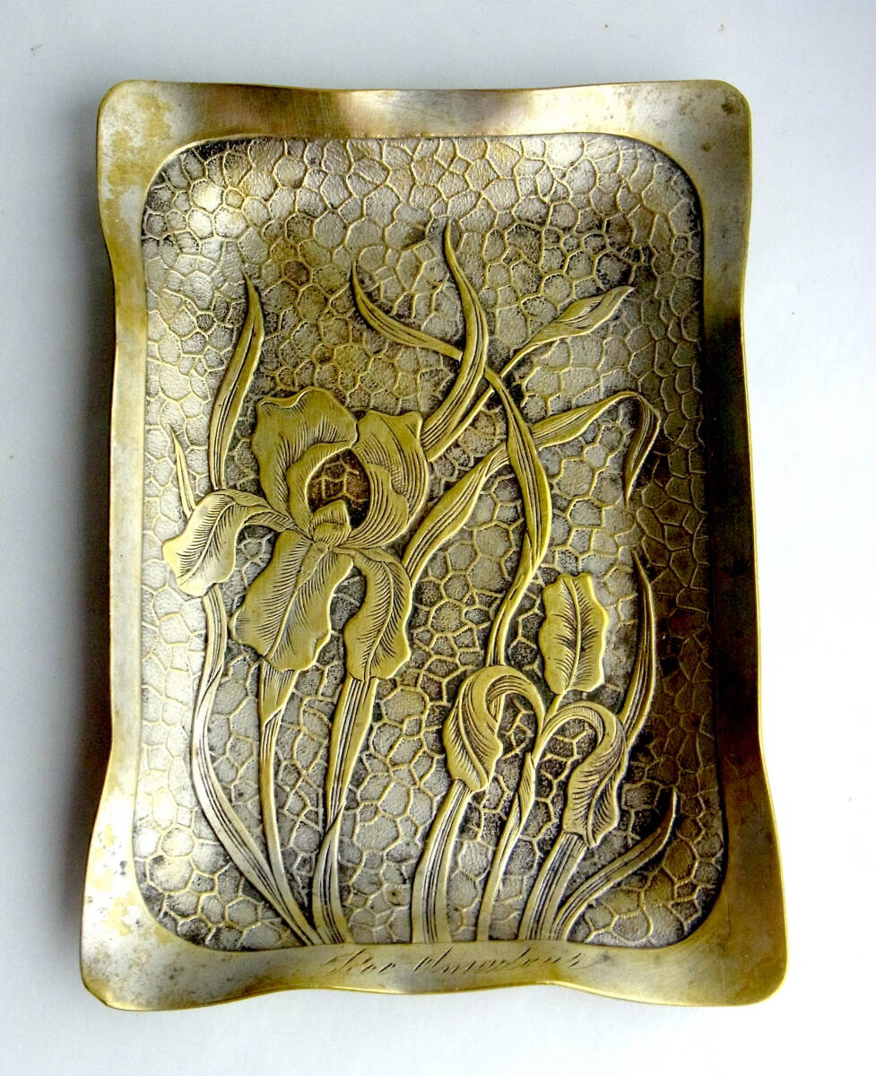 - 美 フランスアンティーク ヴィドポッシュ 小さなトレイ 小物入れ アイリス 菖蒲文様 アールヌーヴォー意匠 クロネコ宅急便発送