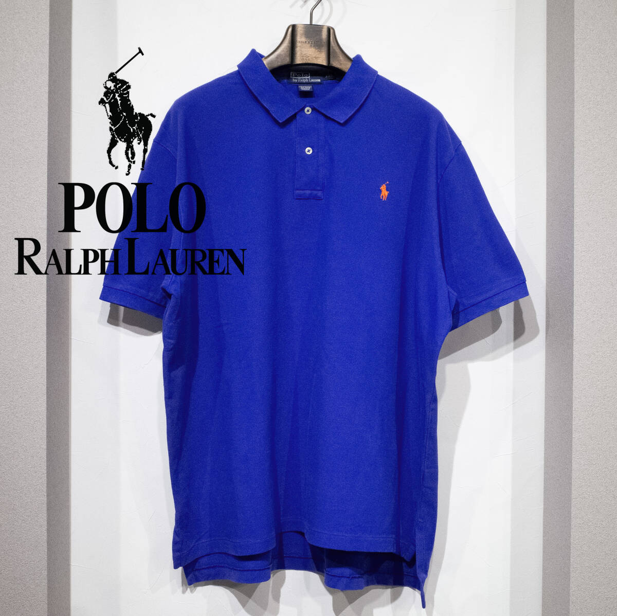 > XXL / 90s POLO by RALPH LAUREN ラルフローレン EXCLUSIVE OF DECORATION 半袖 鹿の子 ポロシャツ ブルー オレンジポニー 刺繍 US古着