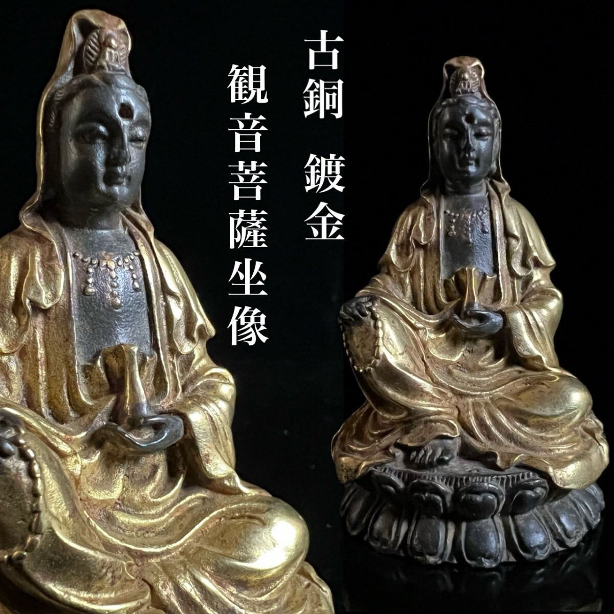 - 中国古玩 時代 古銅 鍍金 観音菩薩坐像 9cm 280g 仏像 細密彫刻 唐物 チベット 仏教美術 骨董 [麌]