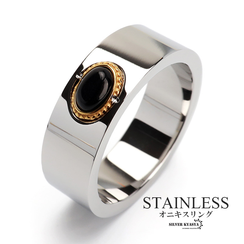 > (11号) ステンレス オニキスリング シルバー シンプルリング 平打リング 一粒リング メンズ 男性 指輪 金属アレルギー対応