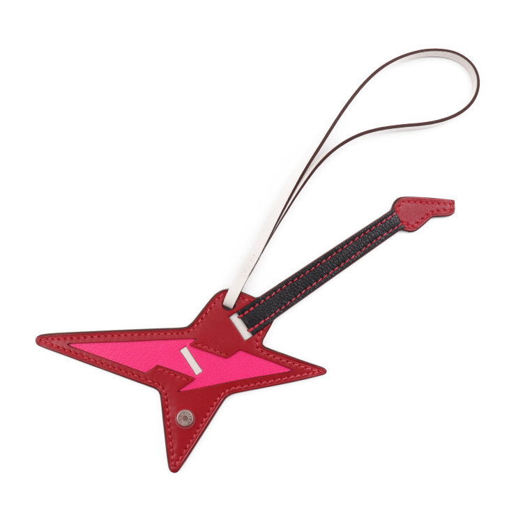 - 新品未使用展示品 エルメス ロック バッグチャーム レザー ルージュヴィフ ローズポップ 黒 白 ピック付き ギター【本物保証】