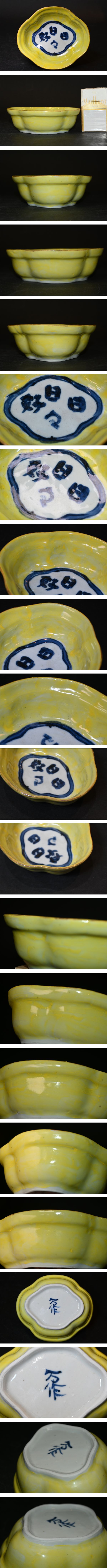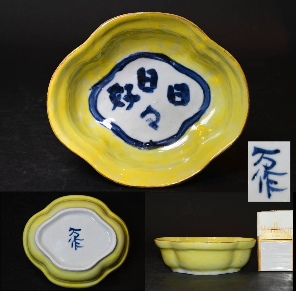 > 真作■中尾万作■ 黄彩 見込みに染付「日々好日」小鉢 皿 箱無 大阪府狭山市生 花形 懐石道具 会席料理 料亭 割烹 茶道具