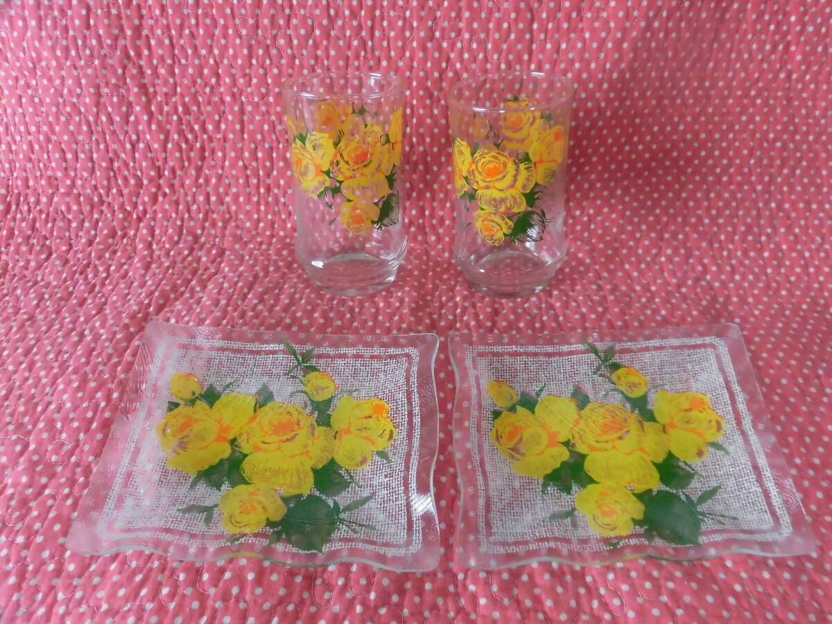 > ●4点まとめて●黄色いバラ柄のガラス皿とグラス●昭和レトロ/小皿/ガラス製タンブラー/ヴィンテージ/フルーツ皿/小物置き/薔薇柄/コップ