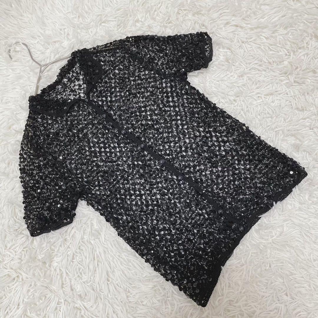 - エイジアビート レース編み半袖シャツ スパンコール 前開き 重ね着 黒 おしゃれ
