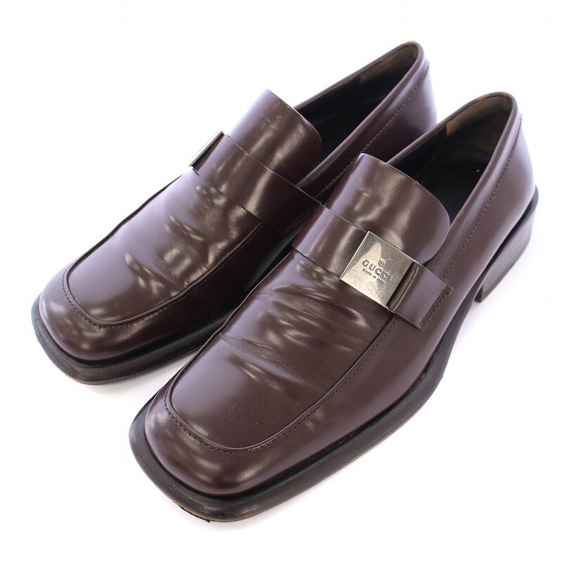 > グッチ GUCCI ローファー スクエアトゥ ローヒール レザー ロゴプレート 42 茶 ブラウン /BB メンズ