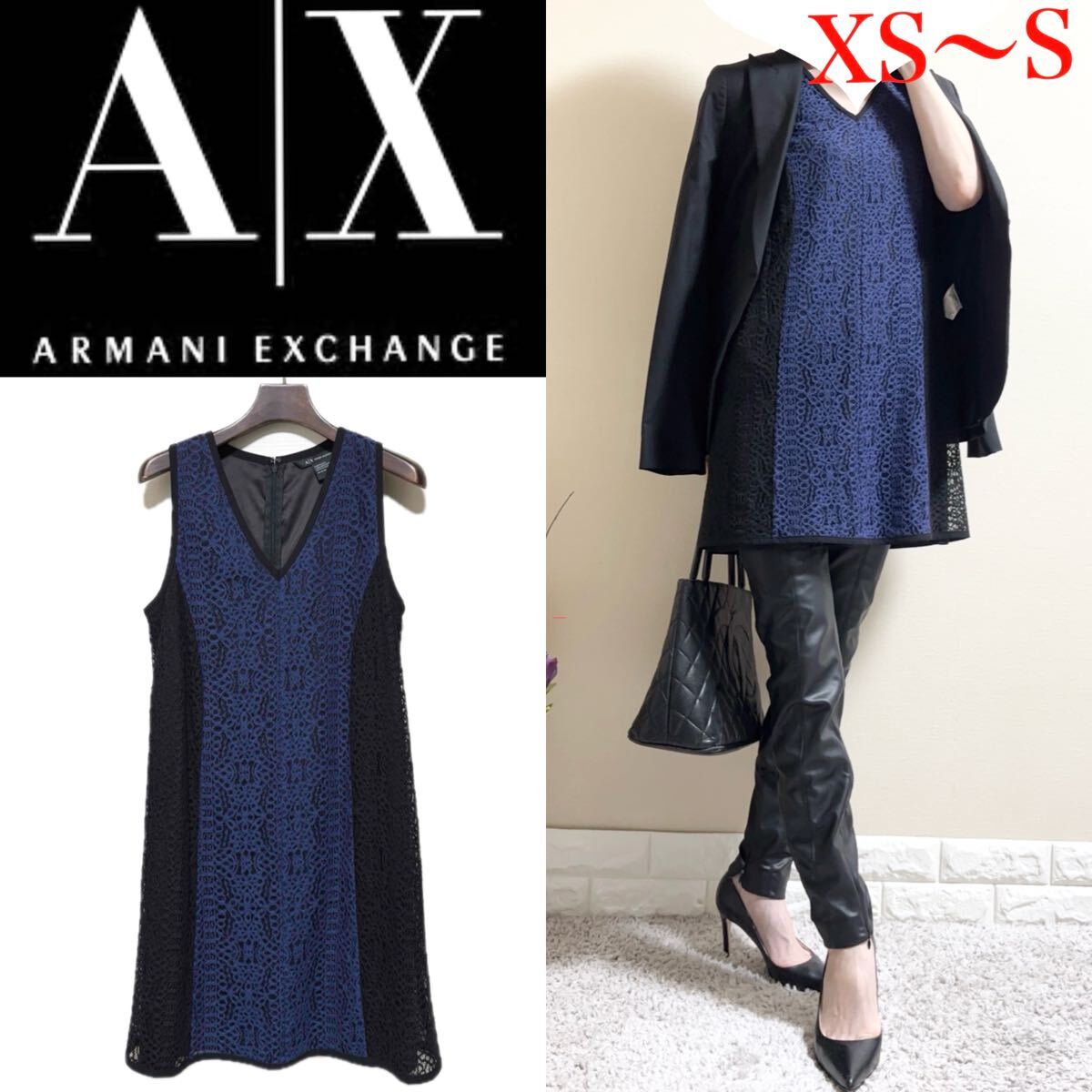 > 極美品!ARMANI EXCHANGE A|Xアルマーニ エクスチェンジ バイカラー 洗える!総レース ストレッチ チュニック XS S 黒 濃紺