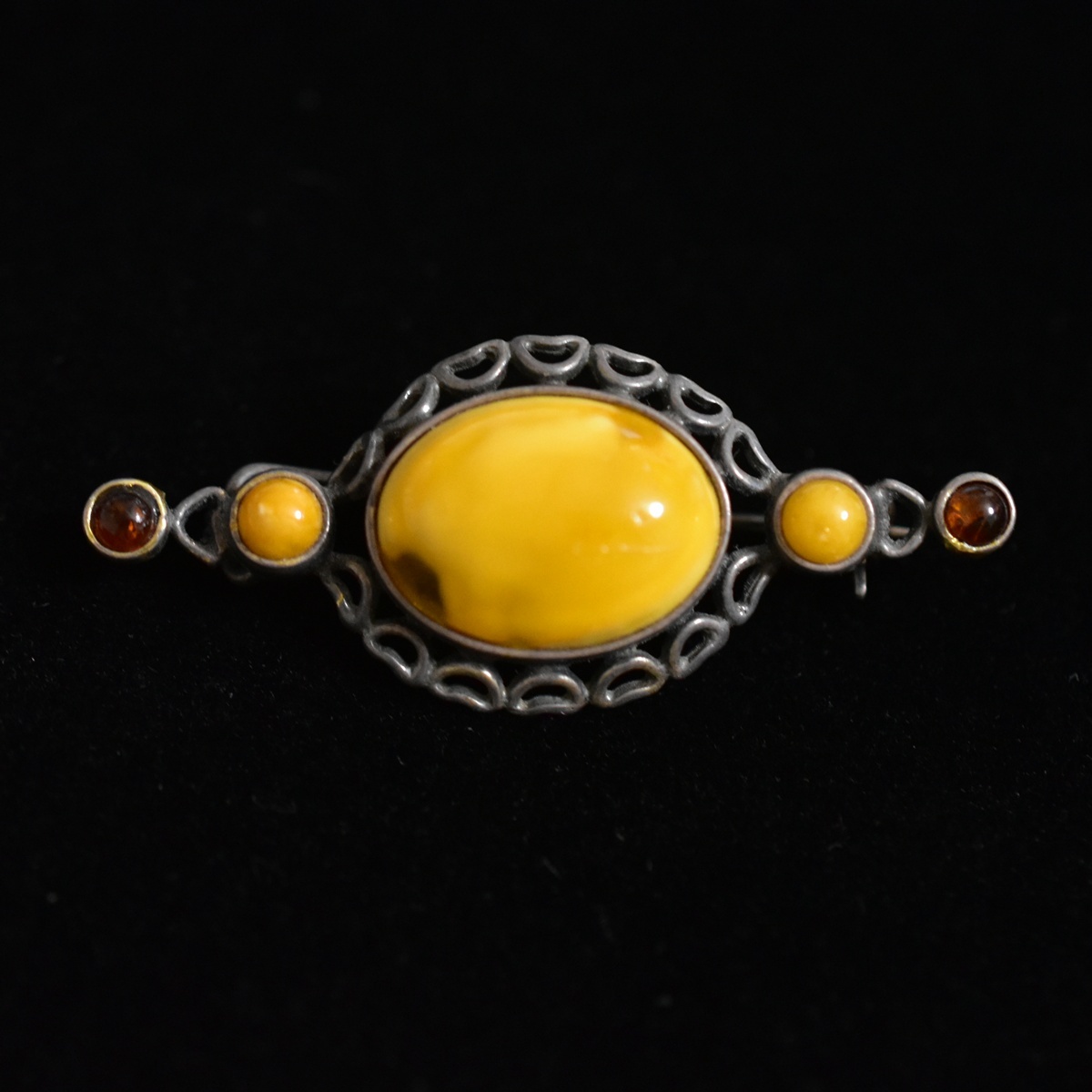 - アンティーク 純銀製 バルト海産ロイヤルアンバー/乳白琥珀/蜜蝋/バタースカッチと銀細工のブローチ 刻印あり 本物保証