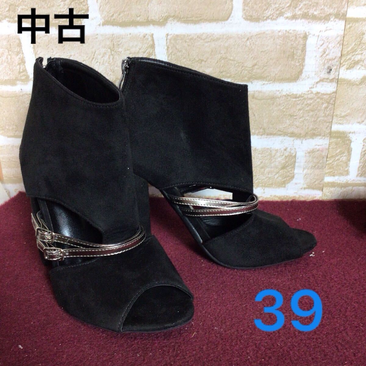 - 【売り切り!送料無料!】A-226 サマーブーツ!39!ブラック!個性的!オープントゥ!スエード素材!太めヒール!!おしゃれ!中古!