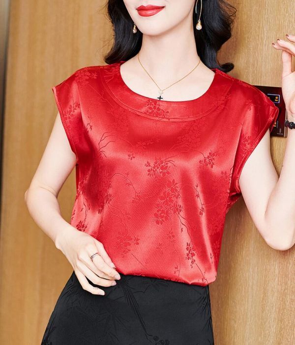 - 夏新品*エレガント つるつる サテン シャツ 上品 ブラウス 気質良い 通勤 大人 ノースリーブ 着痩せ ブラウス トップス * レッド