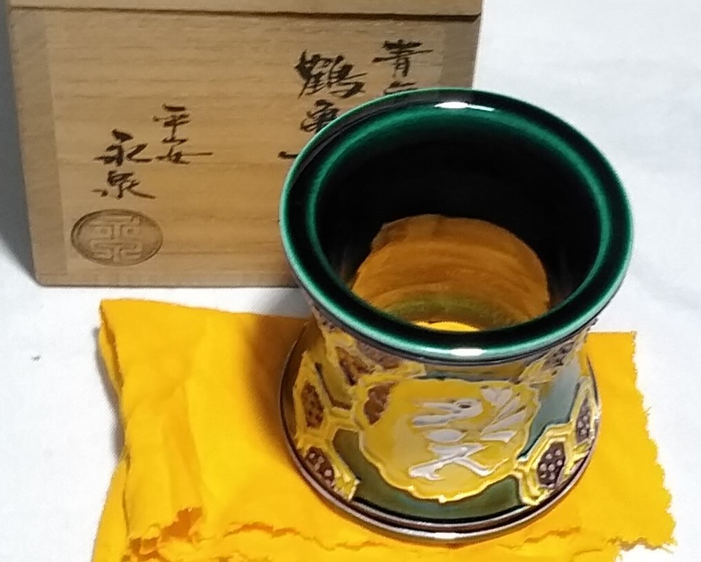 - 茶道具 京都清水焼 平安永泉 勝見永泉作 青交趾鶴亀蓋置 超美品!!