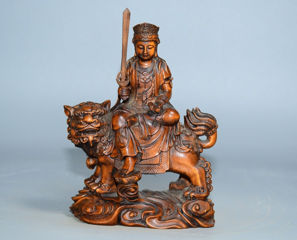 - 『館蔵珍品 黄楊木製 細密彫 文殊菩薩像 仏像 宗教 仏教古美術 供養品』稀少珍蔵品 古賞物 貴重物品 収蔵品 中国古美術 時代物 古董品