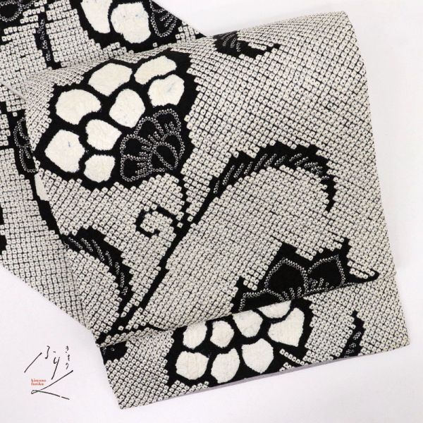 - 【名古屋帯】 総絞り 花唐草模様 白黒モノトーン 正絹着物 NB5-17