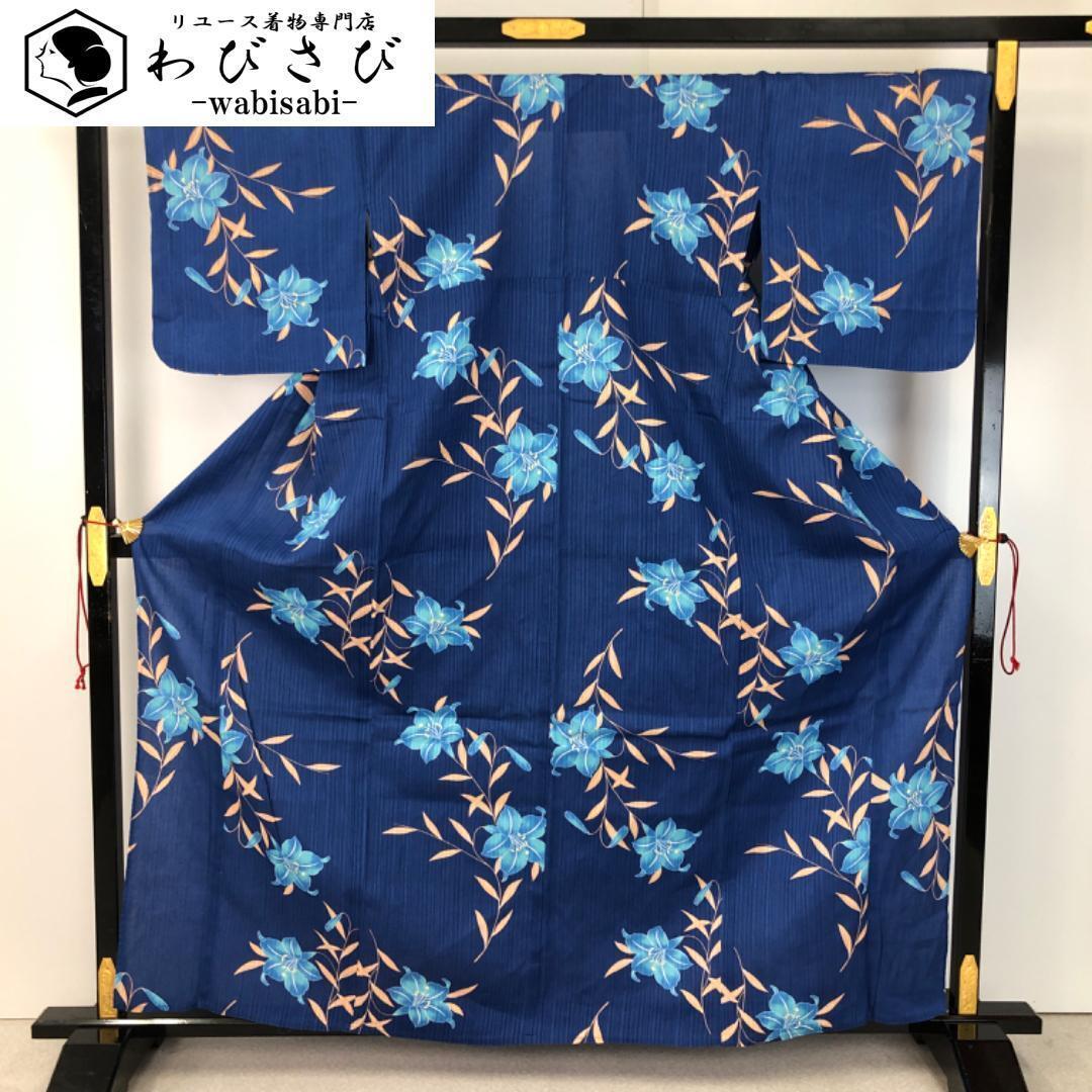 紺碧色のお色味に美しい花模様の柄裄がデザインされた素敵なお品でございます。