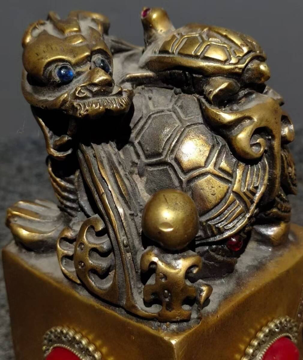 - 清代 秘蔵 古銅印に宝石王侯龍亀玉璽印をはめ込む 印章 印鑒 古印材 印鑑の方 文房具 銅製 銅琉金 唐物 收蔵品 時代物 古置物 供養品 6.3