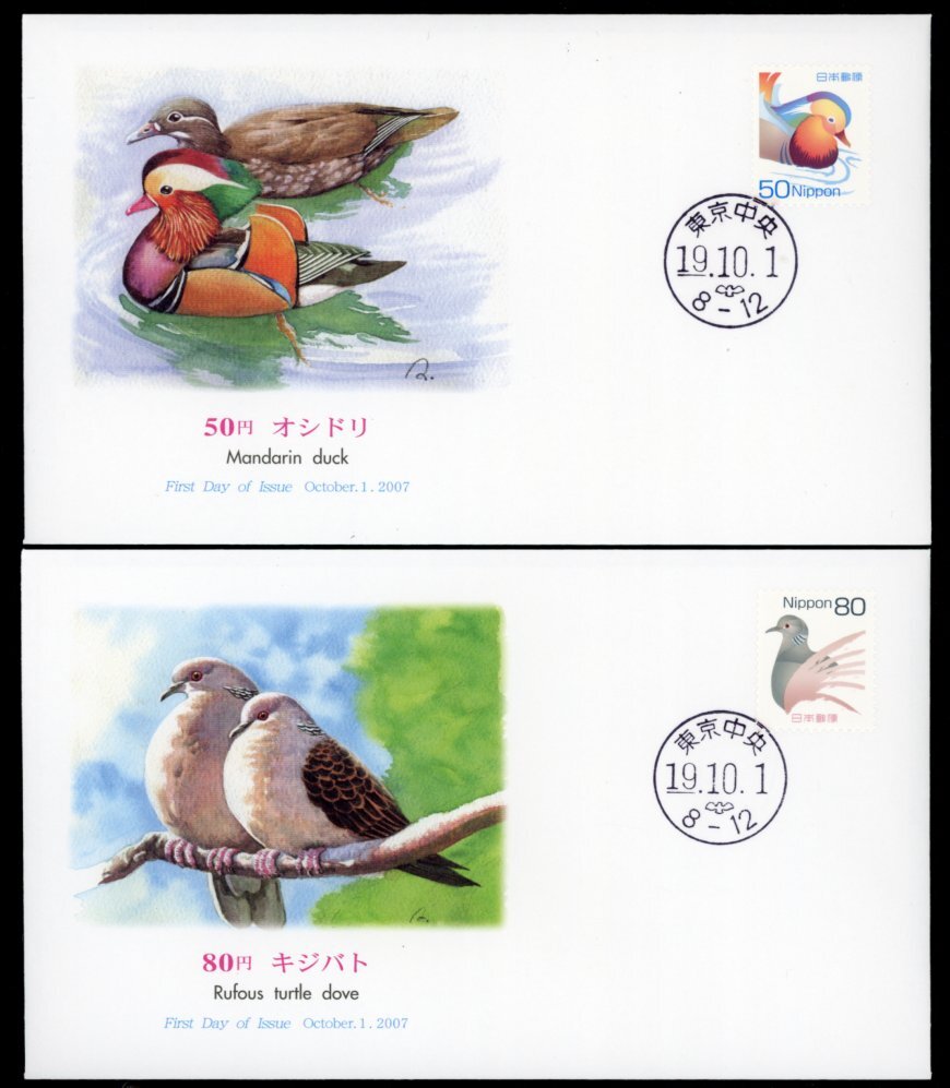 - 0675 【FDC】普通切手 郵便事業会社発足 50円「オシドリ」・80円「キジバト」[東京中央/19.10.1/JPS]