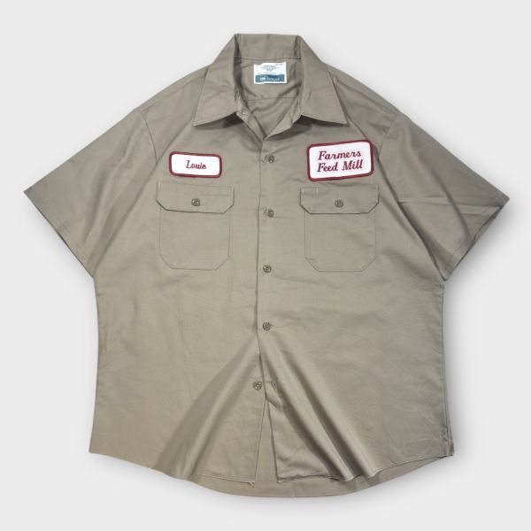 > ★Farmers Feed Millロゴ★Work Leisure 半袖ワークシャツ sizeL ベージュ系 USA 古着 クリーニング プレス済み 2227