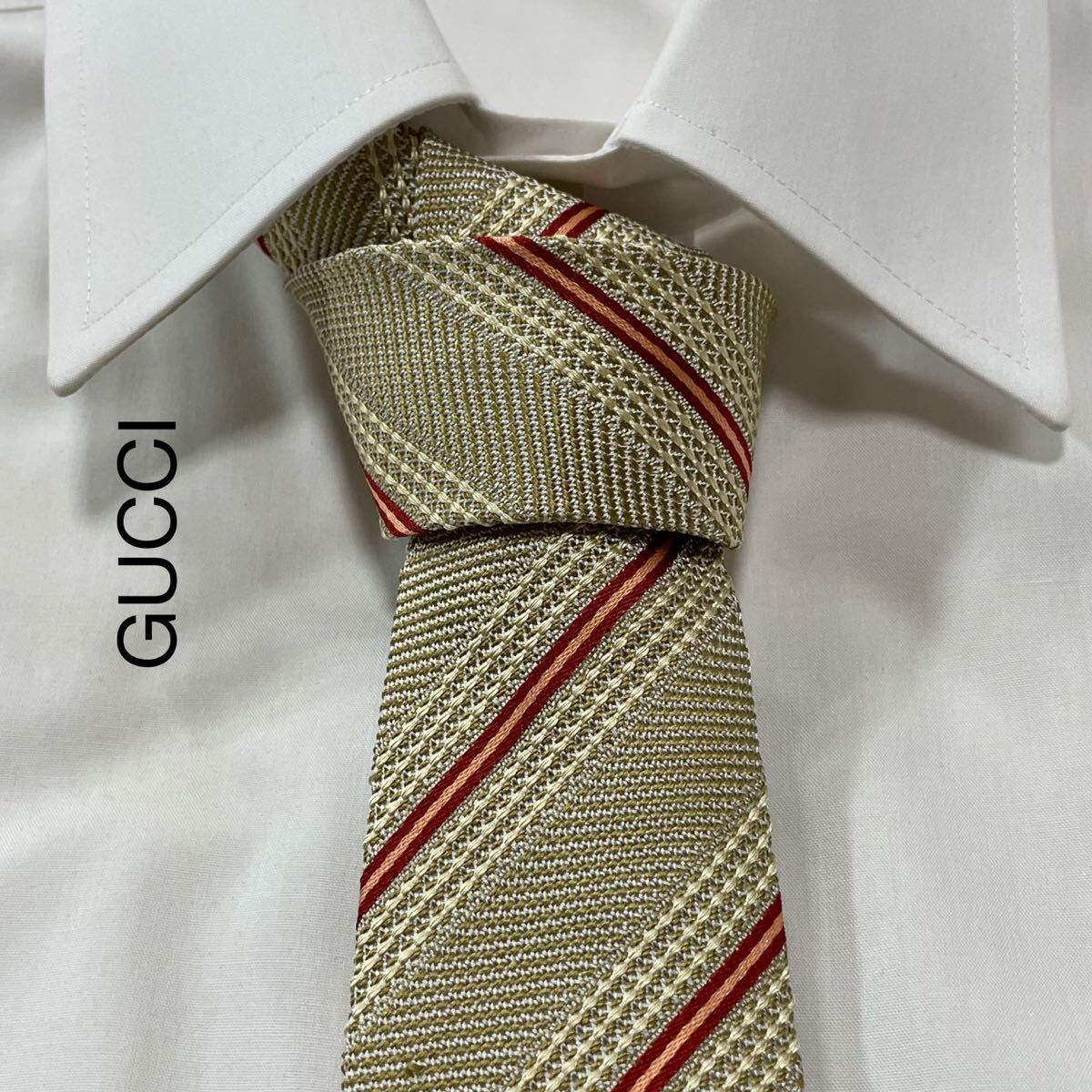 - GUCCI グッチ ストライプ ジャガード シルク ネクタイ イタリア製 ベージュ ワイン オレンジ TG1842