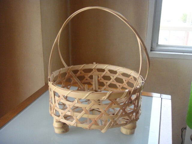 > ◆ 竹かご 六つ目編み持ち手付き三つ脚 直径24cm バスケット 華道具 茶道具 花入れ 手ぬぐい入れ 竹編み 竹籠 竹細工 世田谷発送 引取り可