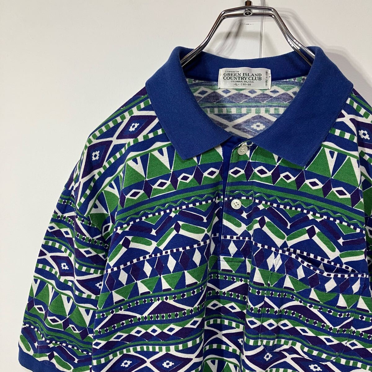 > 古着 ヴィンテージ 幾何学模様 レトロ ポケットリンガー 鹿の子 半袖 ポロシャツ 国産品 ブルー パープル グリーン ホワイト L