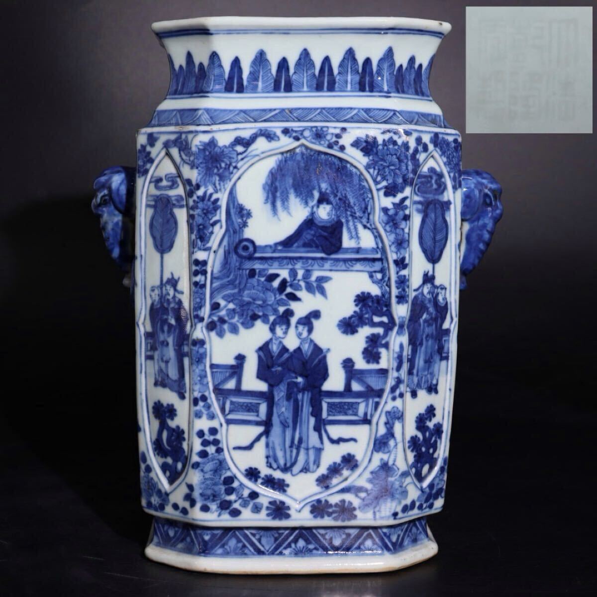 - 大清乾隆年製 底款 染付 人物 ・ 草花文 双耳 花瓶 / 清 乾隆 中国美術 花器 壺 飾壺 煎茶飾 .G1725