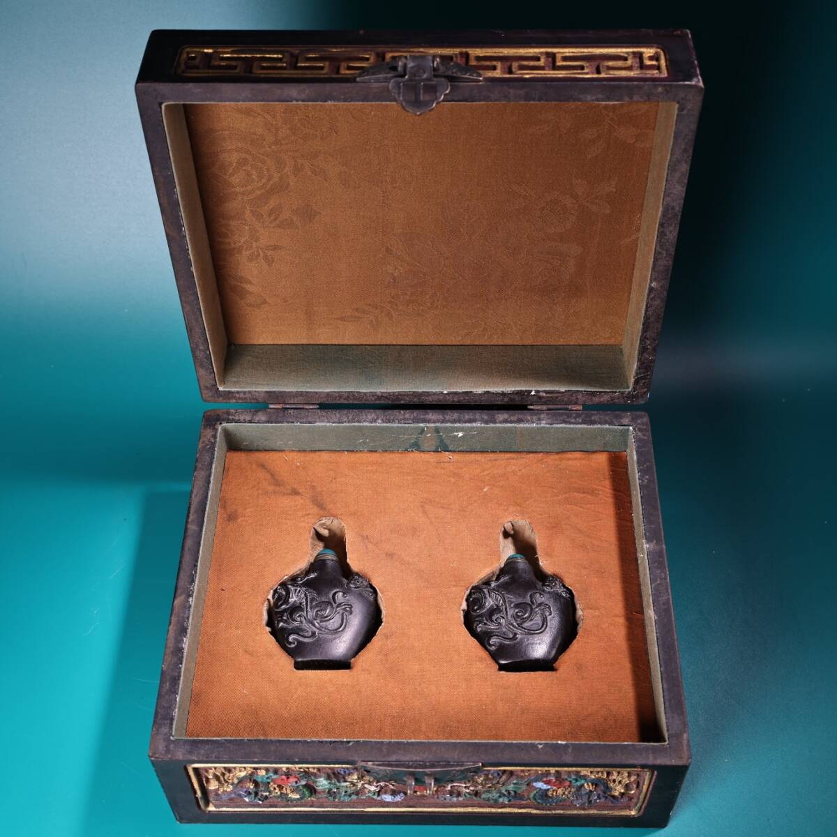 - 蔵友旧蔵出 角材製 細密彫 雙獣紋 鼻煙壺一對 箱付 希少珍品 貴重品 置物 古賞物 中国古玩 中国古美術品