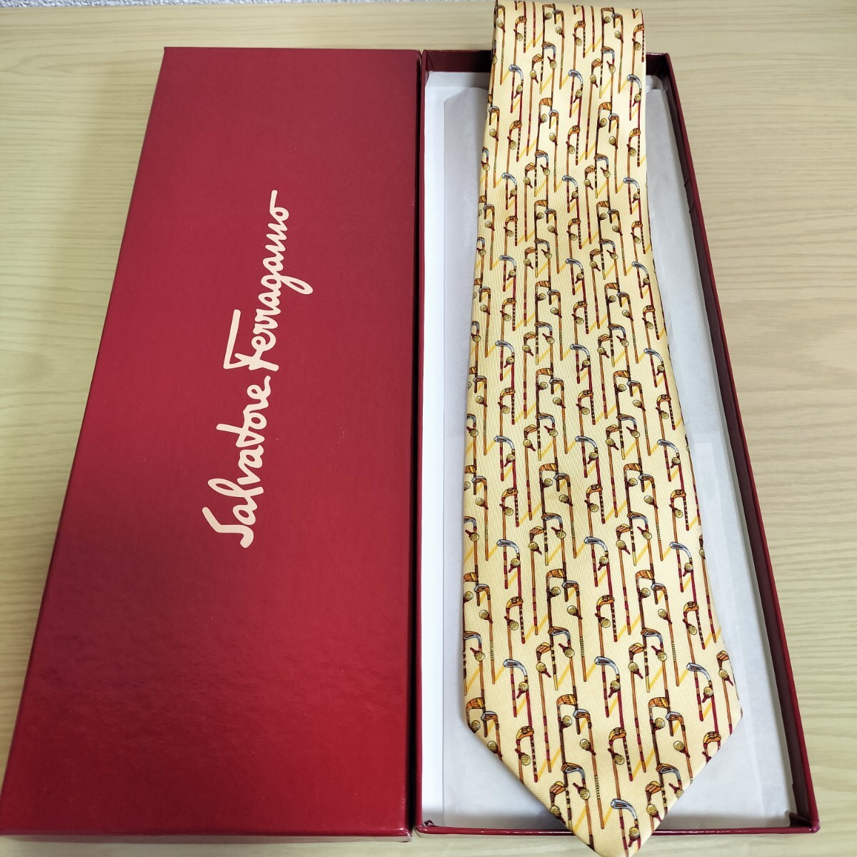- Salvatore Ferragamo(サルヴァトーレフェラガモ)黄色ゴルフクラブ模様ネクタイ