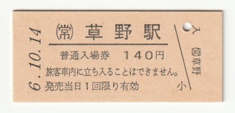 - 平成6年10月14日 常磐線 草野駅 140円硬券普通入場券(日付印刷)