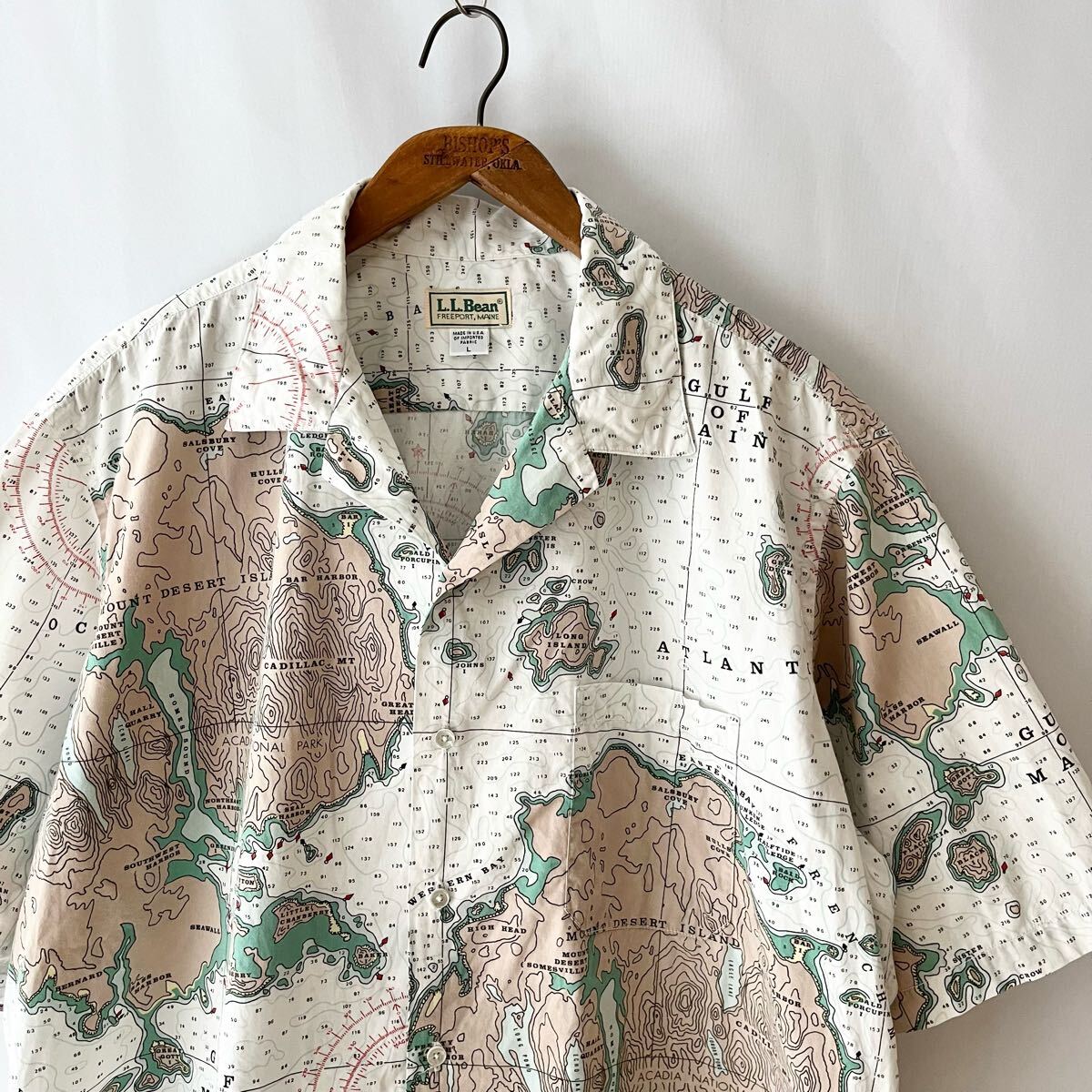 > 80s L.L.Bean メイン湾 航海図 マップ柄 コットン 開襟 半袖 ボックス シャツ L USA製 ビンテージ 80年代 LL Bean LLビーン オープンカラー