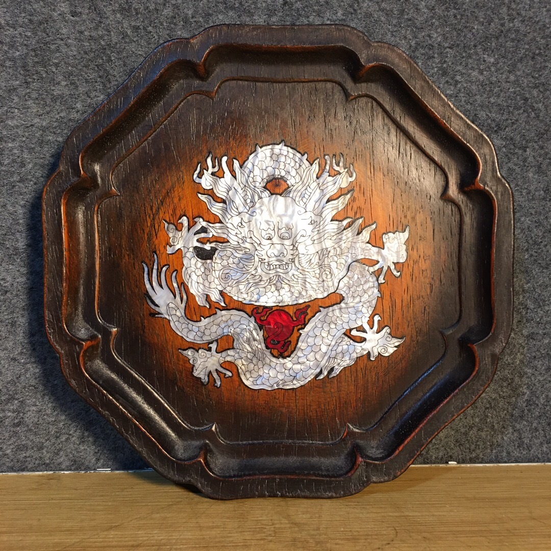 - 蔵友旧蔵出 檀木製 細密彫 貝殼嵌 神龍戲珠紋 茶盤 文房具 置物 賞物 中国時代美術品