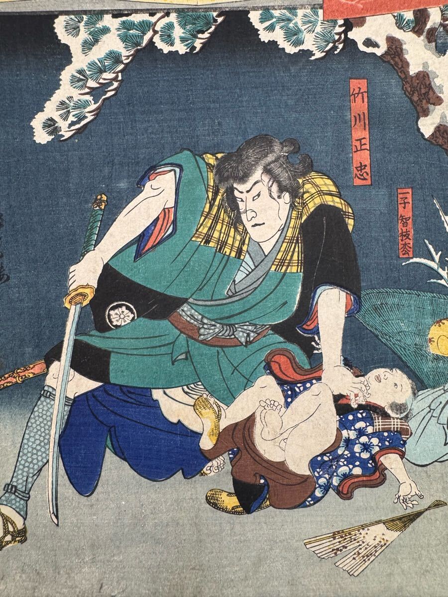 - 【真作】名作!本物浮世絵木版画 落合芳幾「今様擬源氏 四十四 竹川正忠」江戸期 美人図 武者絵 錦絵 大判 保存良い