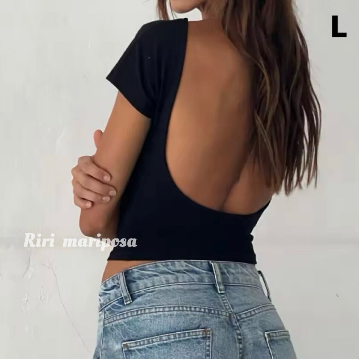 - オープンバック半袖ショートトップス 黒Lサイズ ヨガウェア ダンス Tシャツ