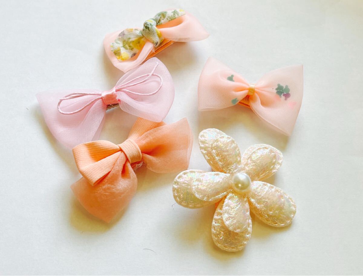 - 可愛いヘアクリップ☆ヘアピン 5点set♪ピンク&オレンジ② リボンモチーフ 布リボン リボンヘアゴム ヘアアクセサリー 無地サテンリボン