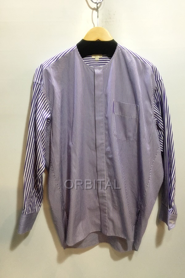 【商品名】:Drawer ドゥロワー ミックスストライプ ノーカラーシャツ コットン ブラウス パープル×ホワイト サイズ36