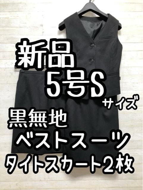 - 新品☆5号サイズ♪黒無地ベストスーツ♪タイトスカート2枚♪事務服☆G843