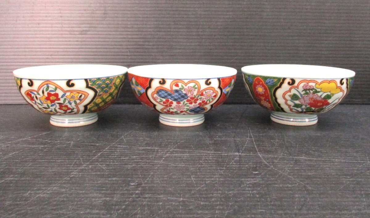> ★ 100744 茶碗 有田焼 清秀 3個 絵柄3種類 直径11.5x高さ5.5cm 中古 ★
