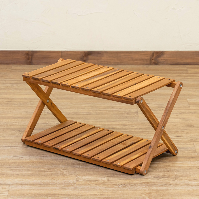 - 木製棚 2段 ラック 収納 おしゃれ 折り畳み ワイド 幅広 物置き 装飾台 飾り棚 小物置き 屋外 アウトドア 庭 玄関 リビング 寝室 子供部屋