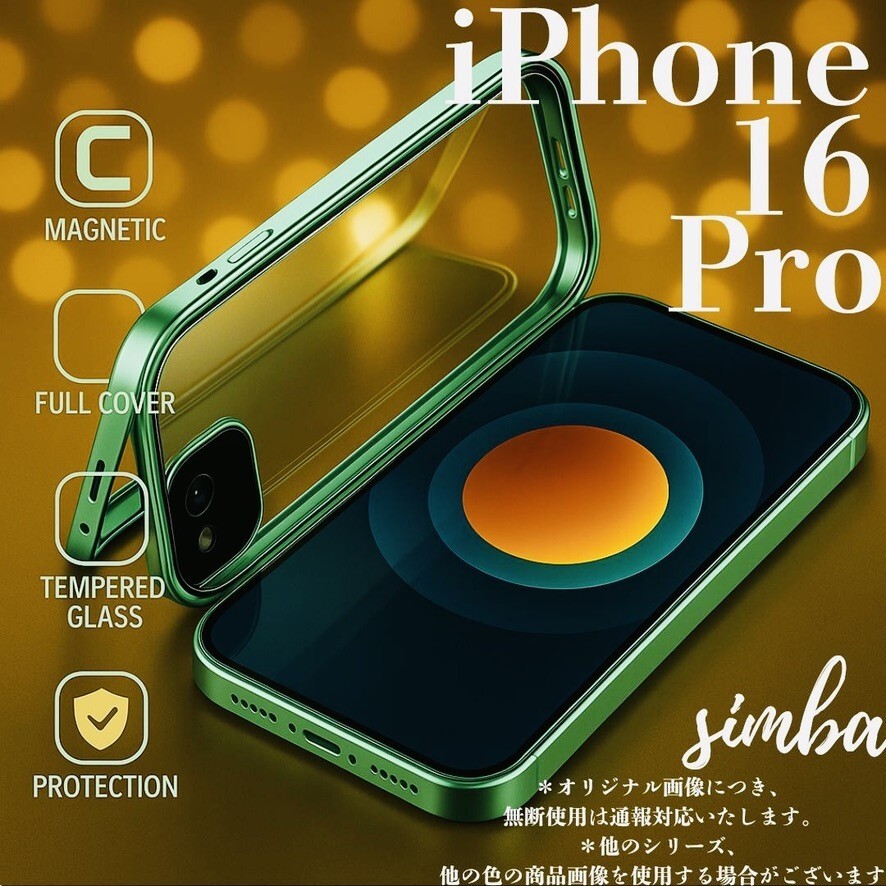 - iPhone 16 Pro ケース グリーン 両面強化ガラス フルカバー 360度保護 高耐久 レンズ保護 おしゃれ 大人 韓国 クリアカバー