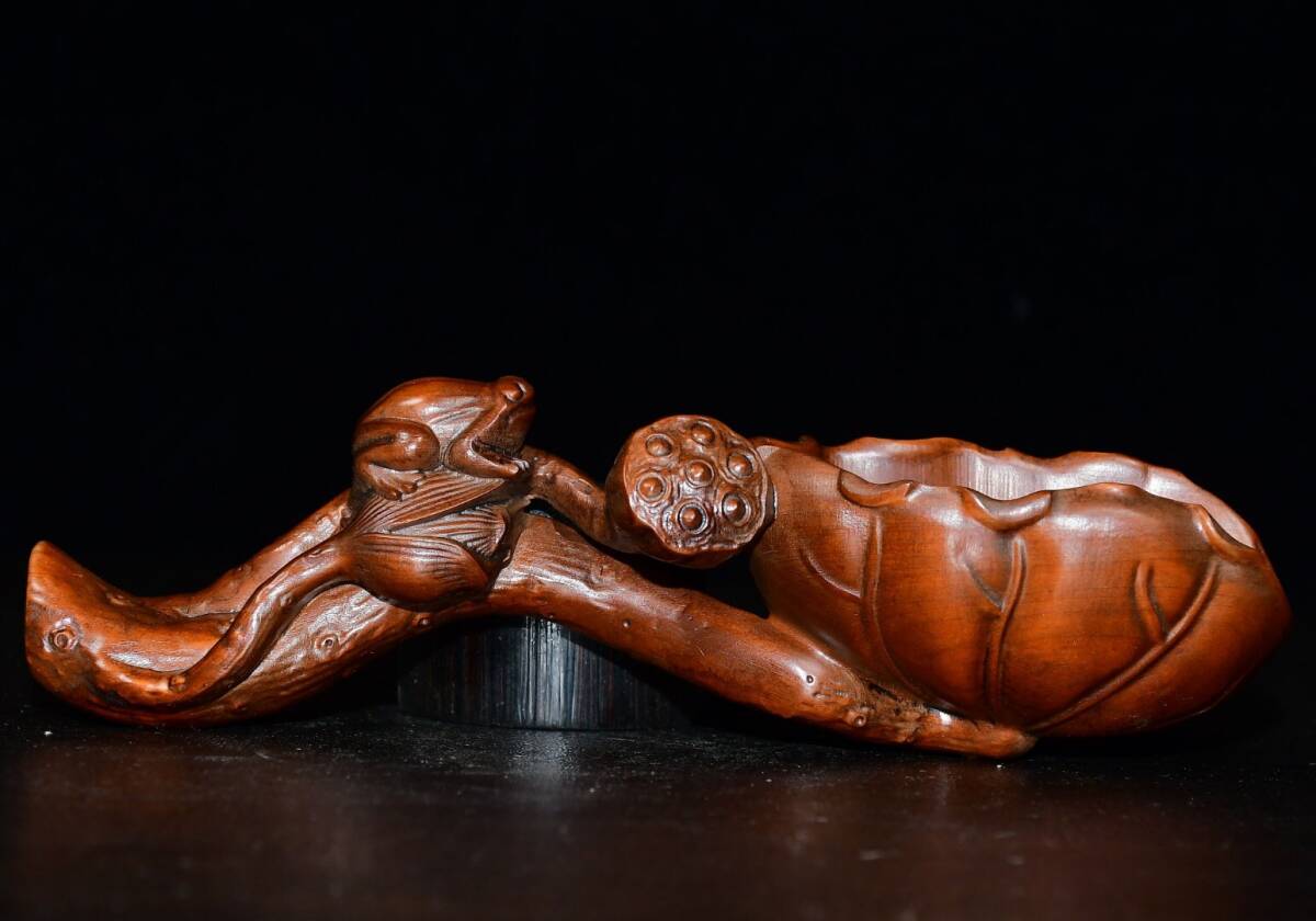 - 蔵友旧蔵出 黄楊木製 細密彫 青蛙荷葉 茶勺 供養品 置物擺件 古賞物 中国古玩 中国古美術品