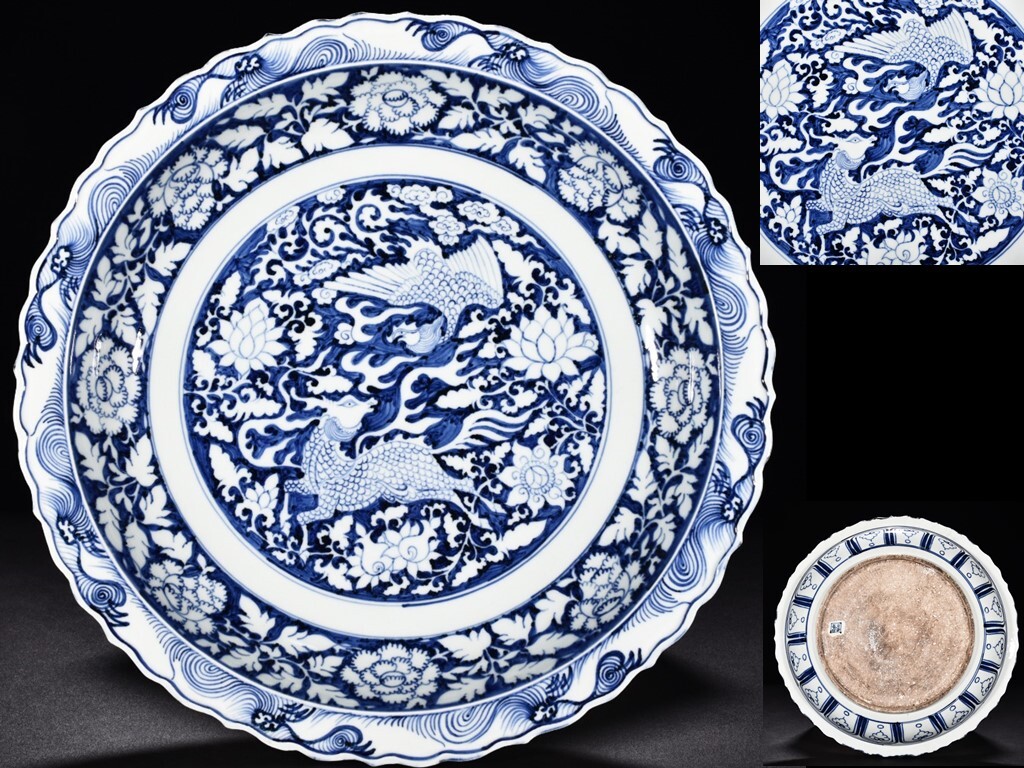 - TB263■中国古玩 唐物 元時代 青花 白滸孤窯款 麒麟鳳凰紋 葵口折沿盤 時代物 極上品■高さ7cm・直径44.7cm■
