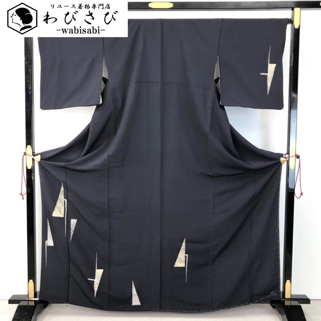 - 付下げ モダンな三角模様 金銀彩 藤煤竹色 縮緬 しつけ糸 K-4937 着物 きもの kimono 和服 和装 中古 リサイクル着物 【送料無料】