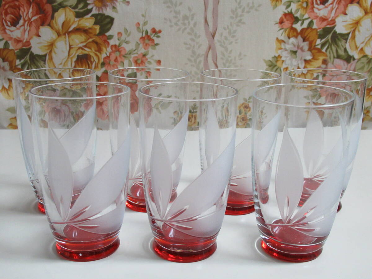 - R7 06★レトロアンティーク タンブラーグラス 7個セット【底:赤色・葉模様カッティング】硝子 コップ