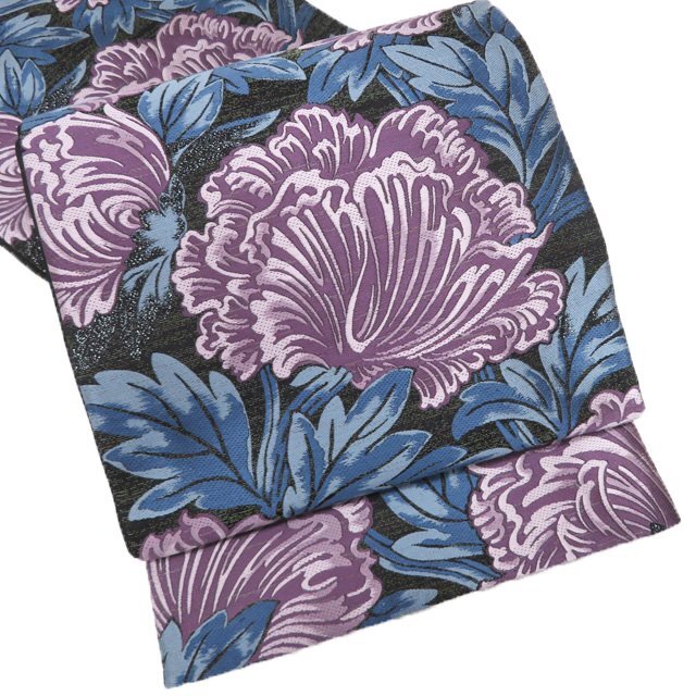 > 特選 袋帯 中古 リサイクル 正絹 カジュアル 仕立て上がり 六通 花模様 反端付き 箔糸 黒色 紫系色 青系色 多色 きもの北條 A1219-16