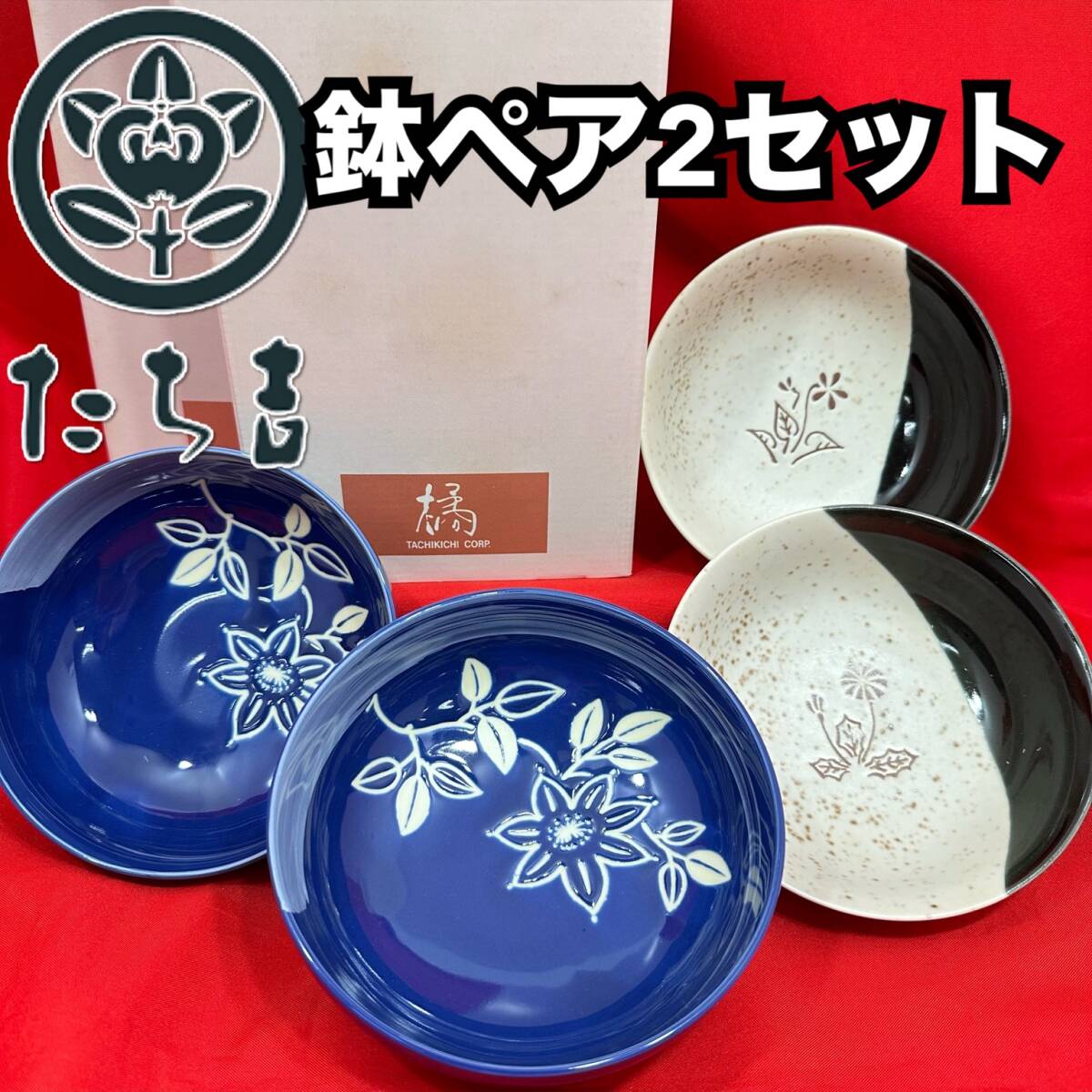 > 【未使用・保管品】橘吉 たち吉 てっせんペア小鉢 早春ペア小鉢 計4客 約13.5cm×13.5cm×4.5〜5.5cm 和食器 深皿 TACHIKICHI (H1713)