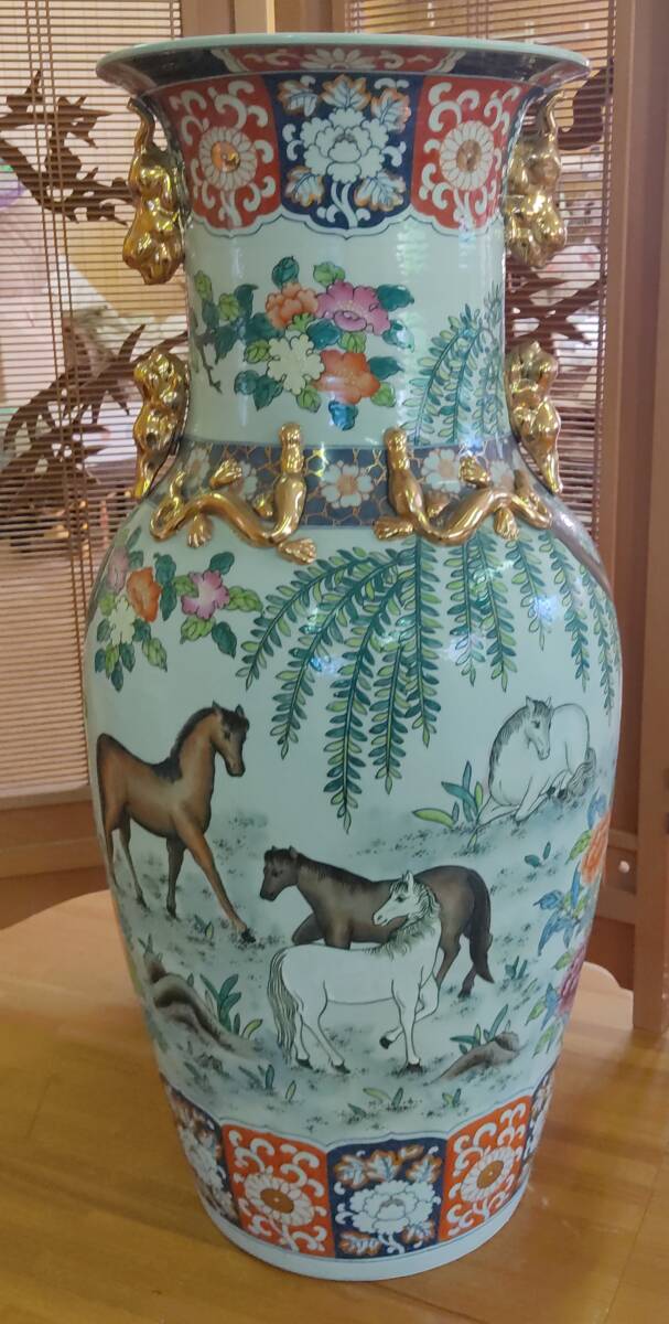 > ⑨福島県南発 92cm 中国美術 双耳大花瓶 金彩 馬 放牧 大型 花瓶 アンティーク オブジェ 中国古玩 中古 手渡し 引取 (送7740~