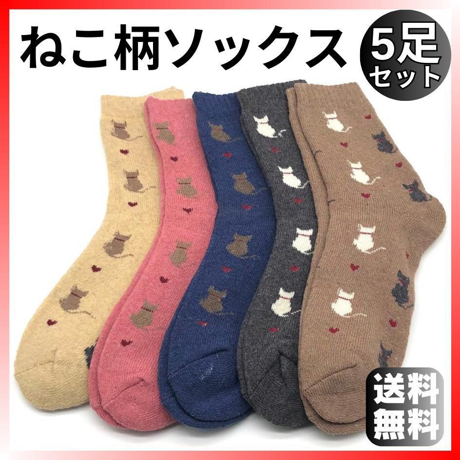 - 【かわいい】猫柄レディースソックス5足セット裏パイルクルー丈厚手暖かいロング